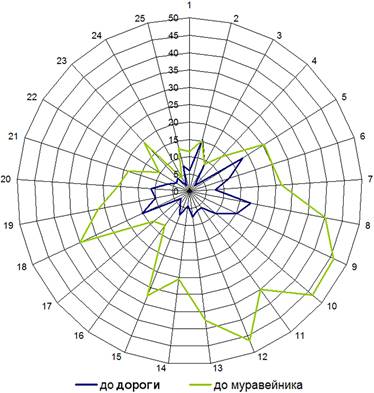 В целом расстояние от нор микромаммалий до муравьиных дорог оказывается достоверно меньше, чем до муравейников (p<0,05, тест Манна-Уитни) (рис. 1, 2).