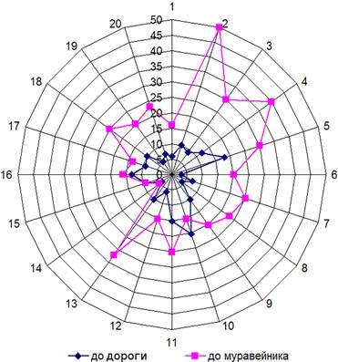 Распределение следов роющей активности микромаммалий в пространстве носит гетерогенный характер. Мы можем выделить две группы. Часть мелких млекопитающих устраивает норы на достаточно близком расстоянии к фактору беспокойства, не отходя от муравейников далее чем на 20 м и от дорог – на 8 м соответственно (условно обозначим их как «бесстрашные», или «тяготеющие»). Возможно, это – следствие конкуренции на ограниченных пространствах, когда более молодые животные оттесняются в менее выгодные условия. Еще одна группа – «умеренно осторожные», их норы расположены на расстоянии 25–40 м от муравейников и 7–12 м – от дорог.