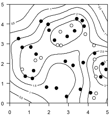 Рисунок 8 – Карта-схема локальной плотности Scabiosa isetensis; поведение кросс-функции Рипли при взаимном размещении A. salsoloides (чёрные точки) и S. isetensis (белые точки с крестом)