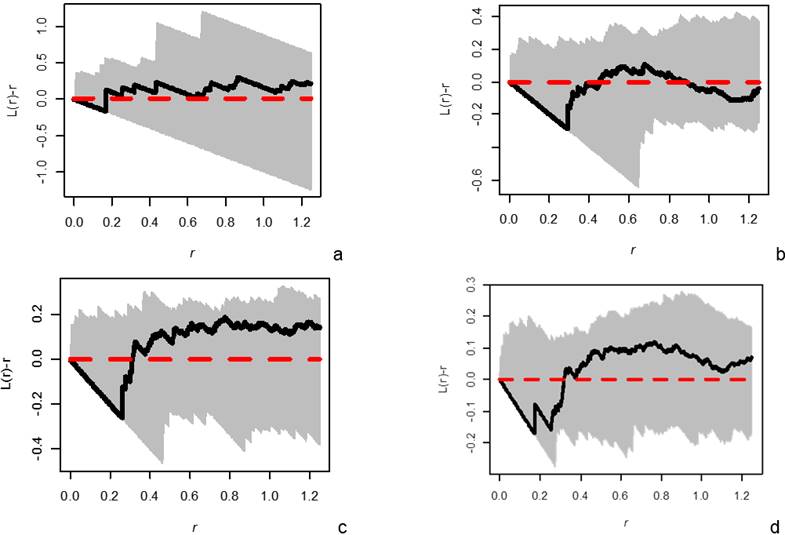 Рисунок 3 – Типы поведения функции Рипли и кросс-функции Рипли в ЦП Artemisia salsoloides. a – прегенеративные особи; b – генеративные особи; c – взаимное размещение генеративных и прегенеративных особей; d – особи без учета возрастных состояний)