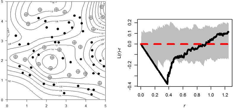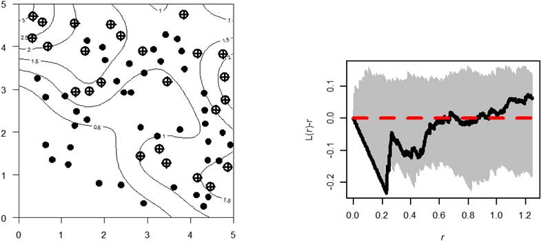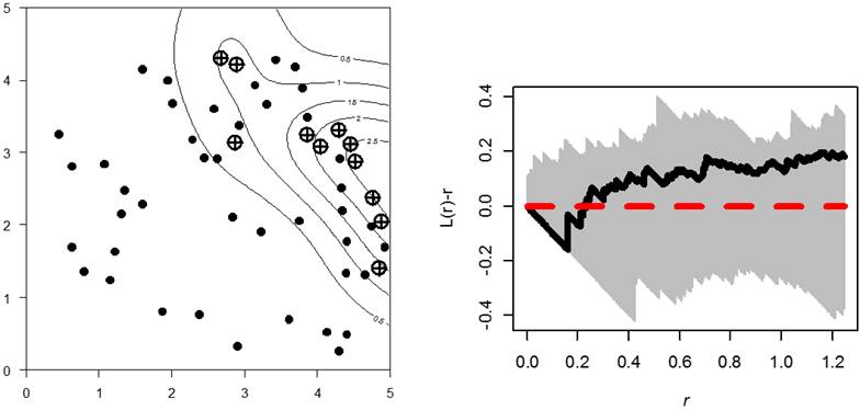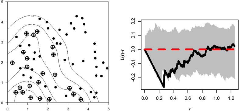 Рисунок 6 – Карта-схема локальной плотности Oxytropis floribunda; поведение кросс-функции Рипли при взаимном размещении A. salsoloides (чёрные точки) и O. floribunda (белые точки с крестом)