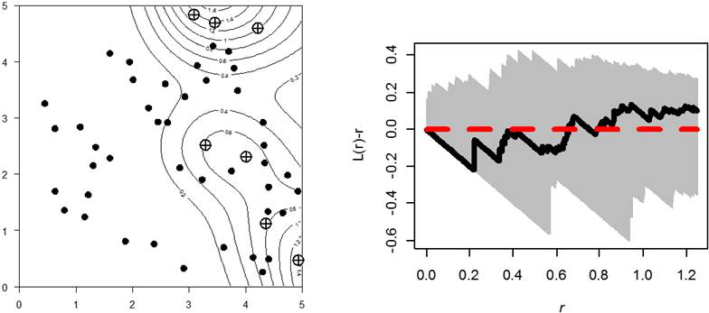 Рисунок 7 – Карта-схема локальной плотности Ephedra distachya; поведение кросс-функции Рипли при взаимном размещении A. salsoloides (чёрные точки) и E. distachya (белые точки с крестом)