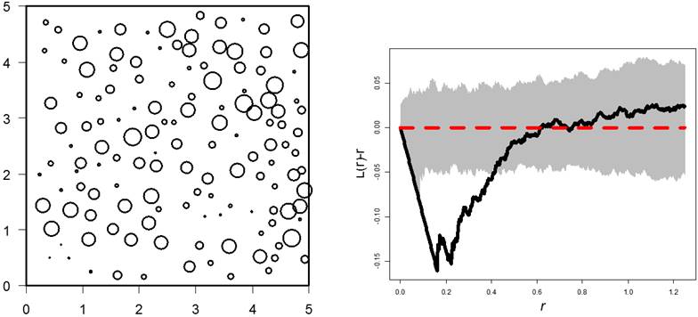 5. Figure 4 - Schematic map of the local density of Stipa korshinskyi; behavior of the Ripley cross-function when A. salsoloides (black dots) and S. korshinskyi (white dots with a cross) are placed