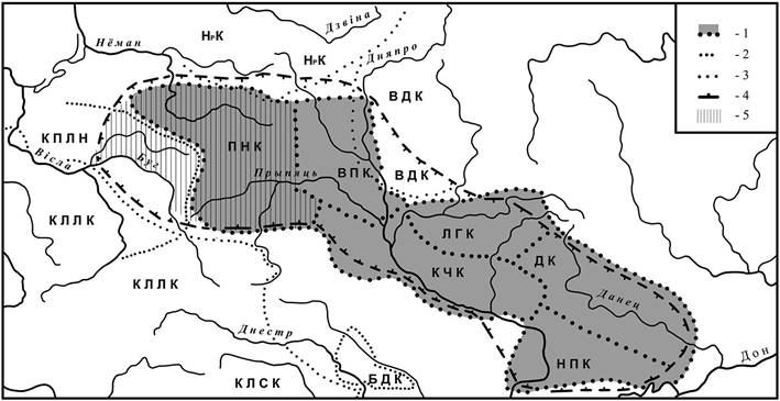 Рисунок 1 – Неолитические культуры между Донцом и Вислой. 1 – днепро-донецкая общность (ДДО); 2 – границы культур ДДО (по Д.Я. Телегину, Е.Н. Титовой, М.М. Чернявскому и др.): НПК – надпорожская культура, ЛГК – лисогубовская, КЧК – киево-черкасская культура, ВПК – восточнополесская культура, ПНК – припятско-нёманская культура; 3 – границы культур, которые не входят в ДДО (в том числе и верхнеднепровской, включение которой в ДДО не является общепризнанным): ВДК – верхнеднепровская культура, НрК – нарвская культура, КПЛН – культура «польского лесного неолита», КЛЛК – культура линейно-ленточной керамики, БДК – буго-днестровская культура; 4 – зона культур гребенчатой керамики (по Л.Л. Зализняку); 5 – территория распространения ПНК в свете последних исследований