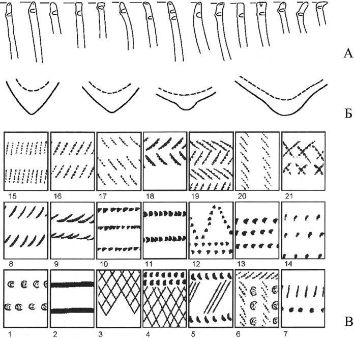 Рисунок 2 – Керамика типа Дубичай: А – венчики, Б – донца, В – орнаментация