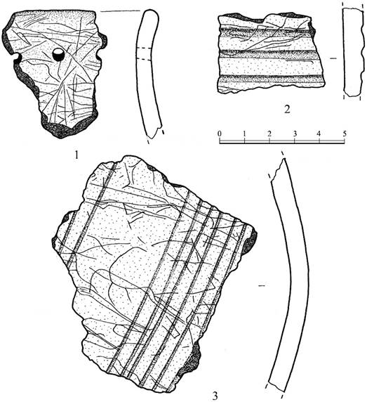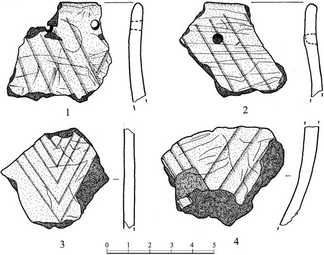 Тонкие прочерченные линии располагались обычно косо или горизонтально, часто образовывали косую сетку; широкие проглаженные – косо, горизонтально или вертикально. Узор из линий иногда дополнялся наколами (рис. 2: В).