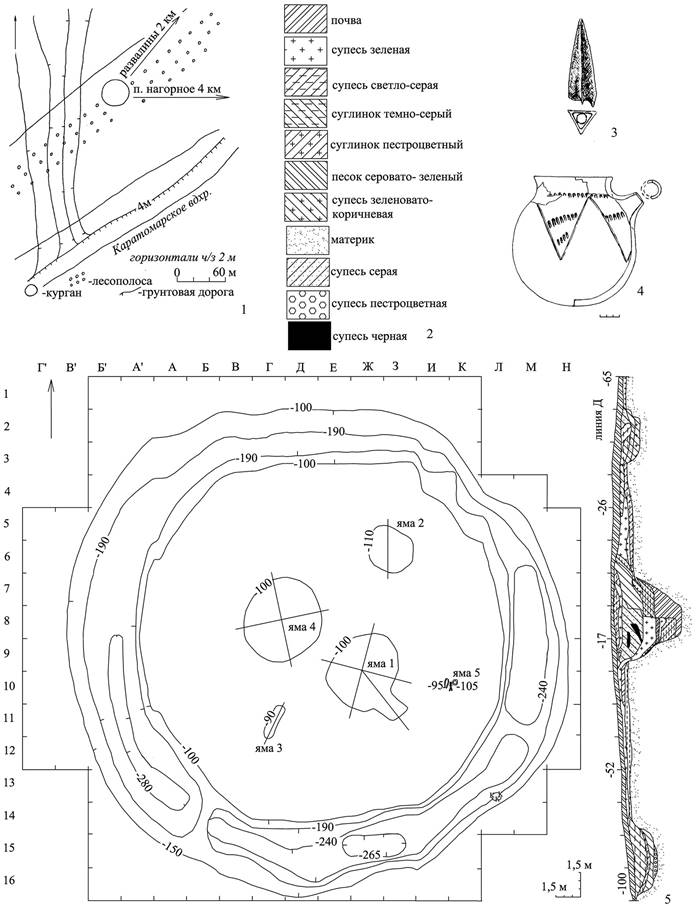 Рисунок 1 – Курган Халвай 5. 1 – ситуационный план; 2 – условные обозначения; 3 – бронзовый наконечник стрелы из ямы № 3; 4 – керамический сосуд из ямы № 3; 5 – план раскопа