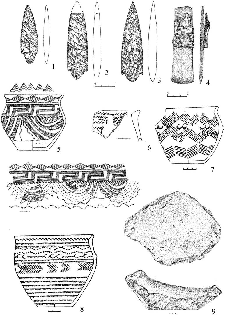 Рисунок 2 – Курган Халвай 5. Погребальный инвентарь. 1–4, 9 – яма № 4; 5, 8 – яма № 1; 6 – яма № 2; 7 – яма № 5. 1–3, 9 – камень; 4 – бронза; 5–8 – керамика