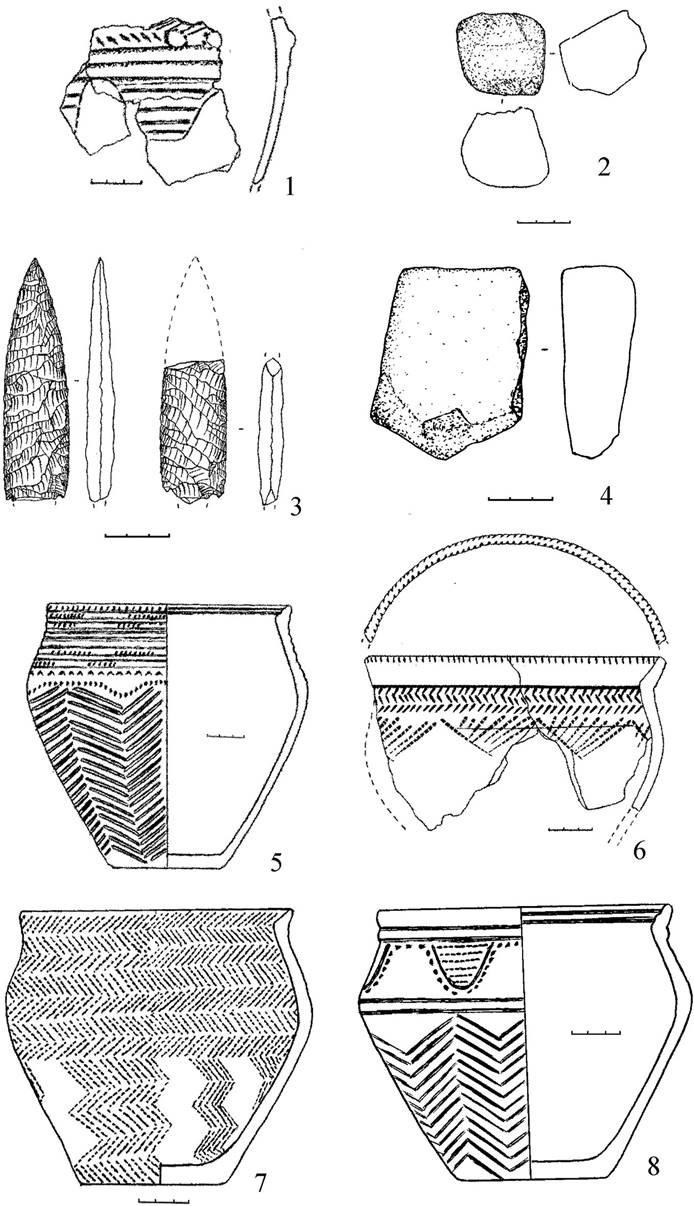 Рисунок 3 – Курган Халвай 5. Погребальный инвентарь из рва. 1, 5–8 – керамика; 2–4 – камень