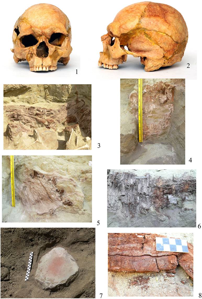 Рисунок 4 – Курган Халвай 5. 1, 2 – реставрированный череп мужчины 25–30 лет из ямы № 1; 3, 6 – остатки перекрытия ямы № 1; 4 – фрагмент облицовки стены погребальной камеры корой; 5 – слой травы на перекрытии ямы № 1; 7 – каменный зооморфный жертвенник-терочник, частично покрытый охрой из ямы № 4; 8 – следы от деревообрабатывающего инструмента на доске из перекрытия из ямы № 1