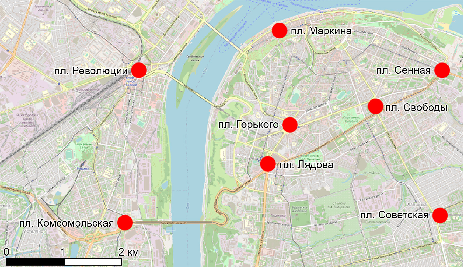 На первом этапе для расчета концентраций приоритетных поллютантов (монооксида углерода, диоксида азота, диоксида серы, озона и взвешенных частиц (PM₂ˏ₅ и PM₁₀)) в соответствии с ГОСТ Р 56162-2019 [14] проведен учет транспортного трафика на площадях г. Н. Новгорода. В качестве модельных объектов были выбраны площади с максимальной транспортной загруженностью на крупнейших площадях г. Н. Новгорода: в Нагорной (пл. Лядова, пл. Горького, пл. Свободы, пл. Сенная, пл. Маркина, пл. Советская) и Заречной (пл. Революции, пл. Комсомольская) частях города (рис. 1).