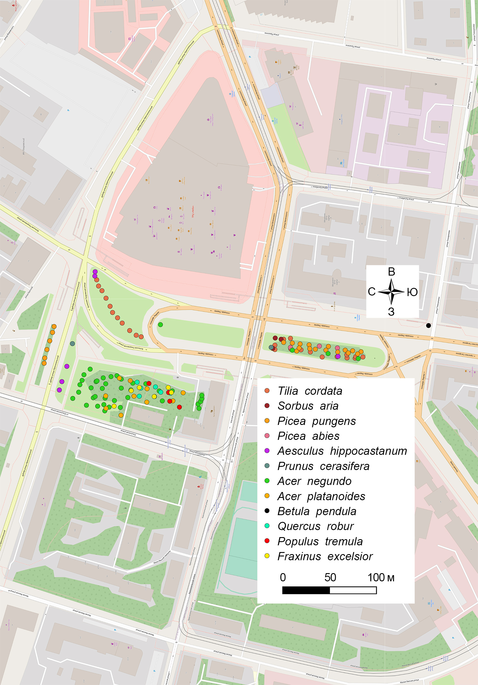 На втором этапе для расчета осаждения поллютантов на листовую поверхность зелёных насаждений была проведена инвентаризация древесной растительности на исследуемых площадях согласно методике «i-Tree Eco» (оценены вид, диаметр ствола и кроны, общая высота, высота кроны, высота ствола до кроны, освещенность кроны, процент мертвых ветвей в кроне) [17].
