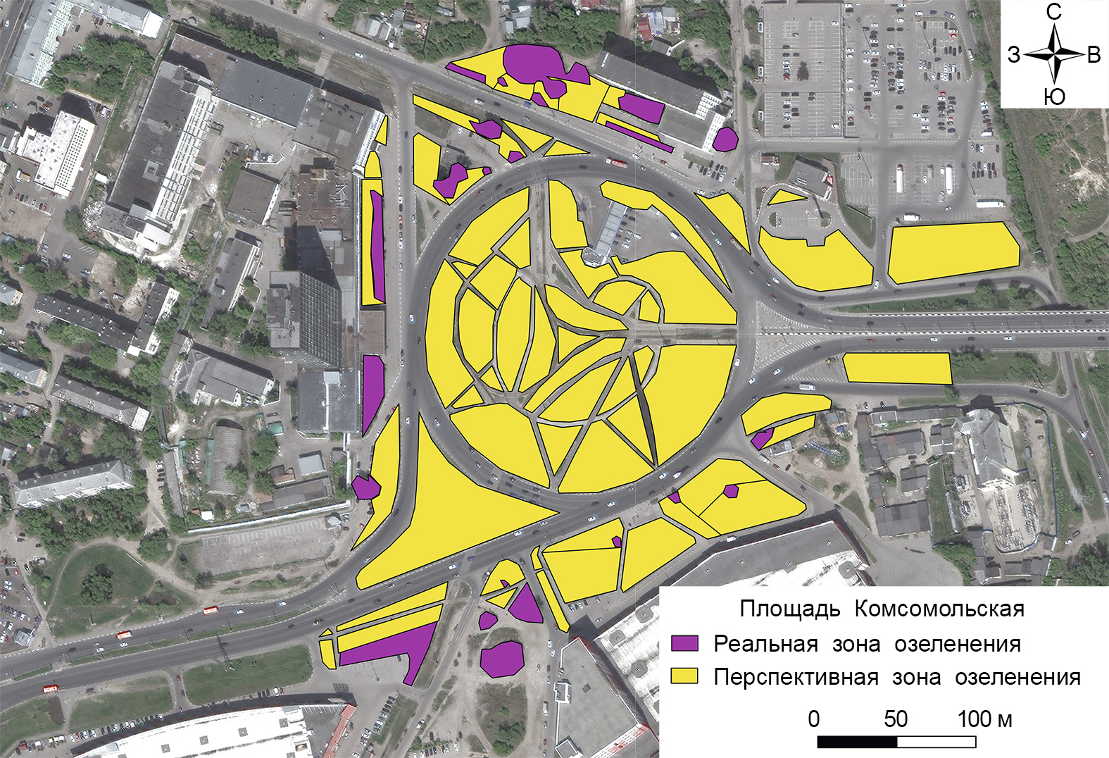 На основе созданных карт реального озеленения исследуемых площадей в программе QGIS Desktop были разработаны проекты по расширению озеленения их территорий. В качестве примера на рис. 3 приведен проект по перспективному озеленению пл. Комсомольской. Согласно предложенному проекту, очистка атмосферного воздуха от приоритетных поллютантов вблизи пл. Комсомольской может достичь 91,54%, т.е. увеличится на 83%.