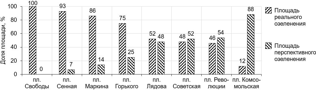 При реализации предложенных проектов перспективного озеленения: на пл. Лядова очистка воздуха древесным покровом составит 56,9% (увеличится на 13,8%), на пл. Советской – 69,78% (увеличится на 39,56%), на пл. Маркина – 52,65% (увеличится на 5,3%), на пл. Горького – 75,9% (увеличится на 24%), на пл. Сенной – 50,73% (увеличится на 1,46%), на пл. Революции – 67,5% (увеличится на 35,1%), Для пл. Свободы проект перспективного озеленения не создавался, т.к. территория озеленена в полной мере (рис. 4).