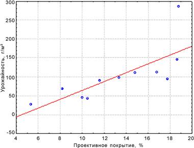 Методом множественного регрессионного анализа выявлена достоверная зависимость (R = 0,71–0,97) между урожайностью сырья и проективным покрытием надземной части лекарственных растений. В общем виде величина урожайности сырья может быть представлена уравнением регрессии, имеющим следующий общий вид: