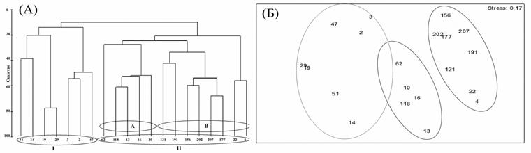 – Б – двумерное шкалирование изученных станций по численности нематод на основании индекса Брея–Кертиса Б