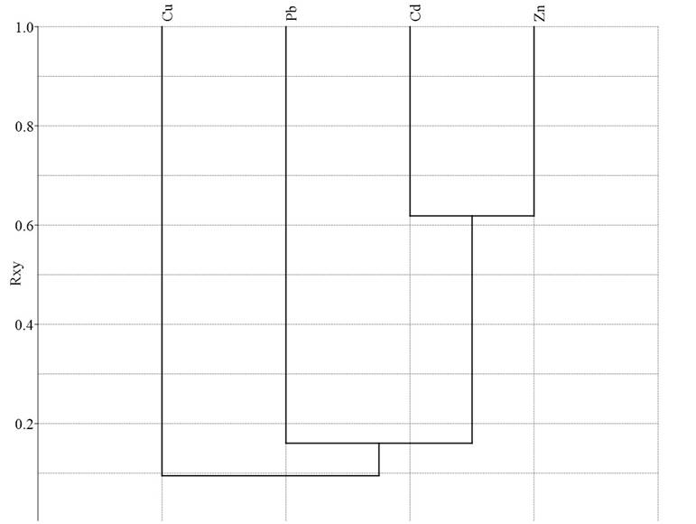 Рисунок 1 – Кластерная дендрограмма, построенная методом средней связи (pair-group method using arithmetic averages), по силе корреляционной связи между металлами по совокупности эколого-геохимических индексов