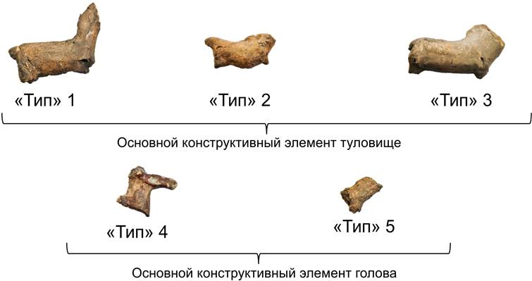 Выделенные типы (4–5) характеризуются наличием основного конструктивного элемента зооморфной пластики – головы. Вспомогательными элементами служит наличие четко выраженных зооморфных черт лица и часто – элементов декора.