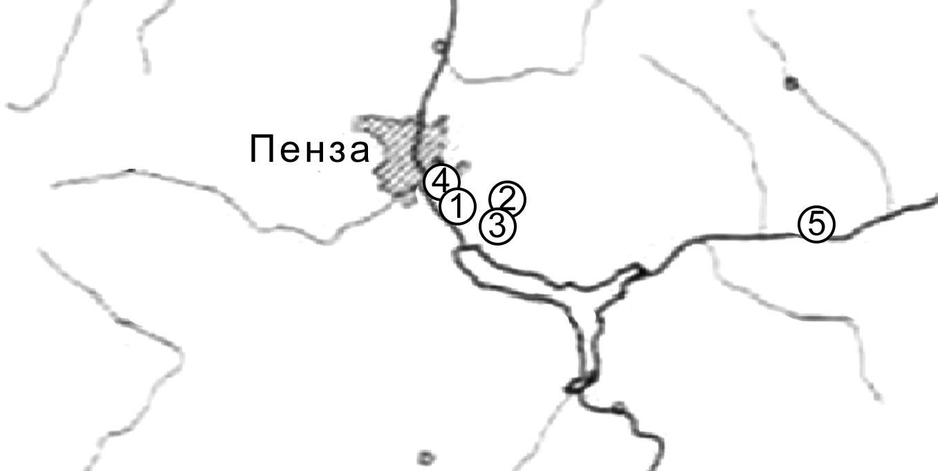 Объектом исследования являются виды грибов семейства Russulaceae особо охраняемых природных территорий (ООПТ), имеющих статус памятников природы регионального значения: «Бурчихинские склоны», «Засурский бор черничник», «Кичкилейский сосняк с дубом», «Никоновский бор» и «Пойменная дубрава» (рис. 1). На их территории находятся эталонные, наименее нарушенные лесохозяйственной и рекреационной деятельностью лесные массивы, в которых в основном представлен весь спектр типов леса, а также экотопов, свойственных Пензенской области. Выбор грибов семейства Russulaceae как объекта исследований связан с тем, что данная таксономическая группа, по сравнению с другими семействами класса Agaricomycetes, на территории Пензенской области наименее изучена. Кроме того, в последние десятилетия произошли существенные изменения в номенклатуре и понимании объема некоторых видов, в связи с этим сведения об этих грибах, опубликованные ранее, нуждались в уточнении [9; 10].