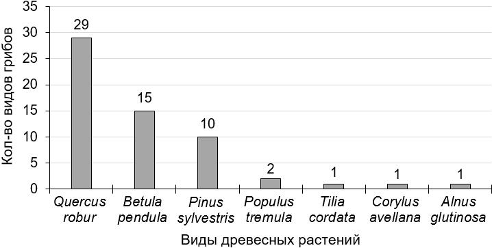 В пределах всех изученных ООПТ выявлено 78 видов грибов семейства Russulaсеае. Из них 24 вида представители рода Lactarius, 3 – рода Lactifluus, и 51 – рода Russula. Все эти виды относятся к эколого-трофической группе симбиотрофов. Из них 19 образуют микоризы с различными древесными видами, а 59 имеют узкую специализацию в отношении партнеров по симбиозу. С Quercus robur связано 29 видов, с Betula pendula – 15, с Pinus sуlvestris – 10, с Populus tremula – 2, с Tilia cordata – 1, с Corylus avellana – 1, с Alnus glutinosa – 1 (рис. 2).
