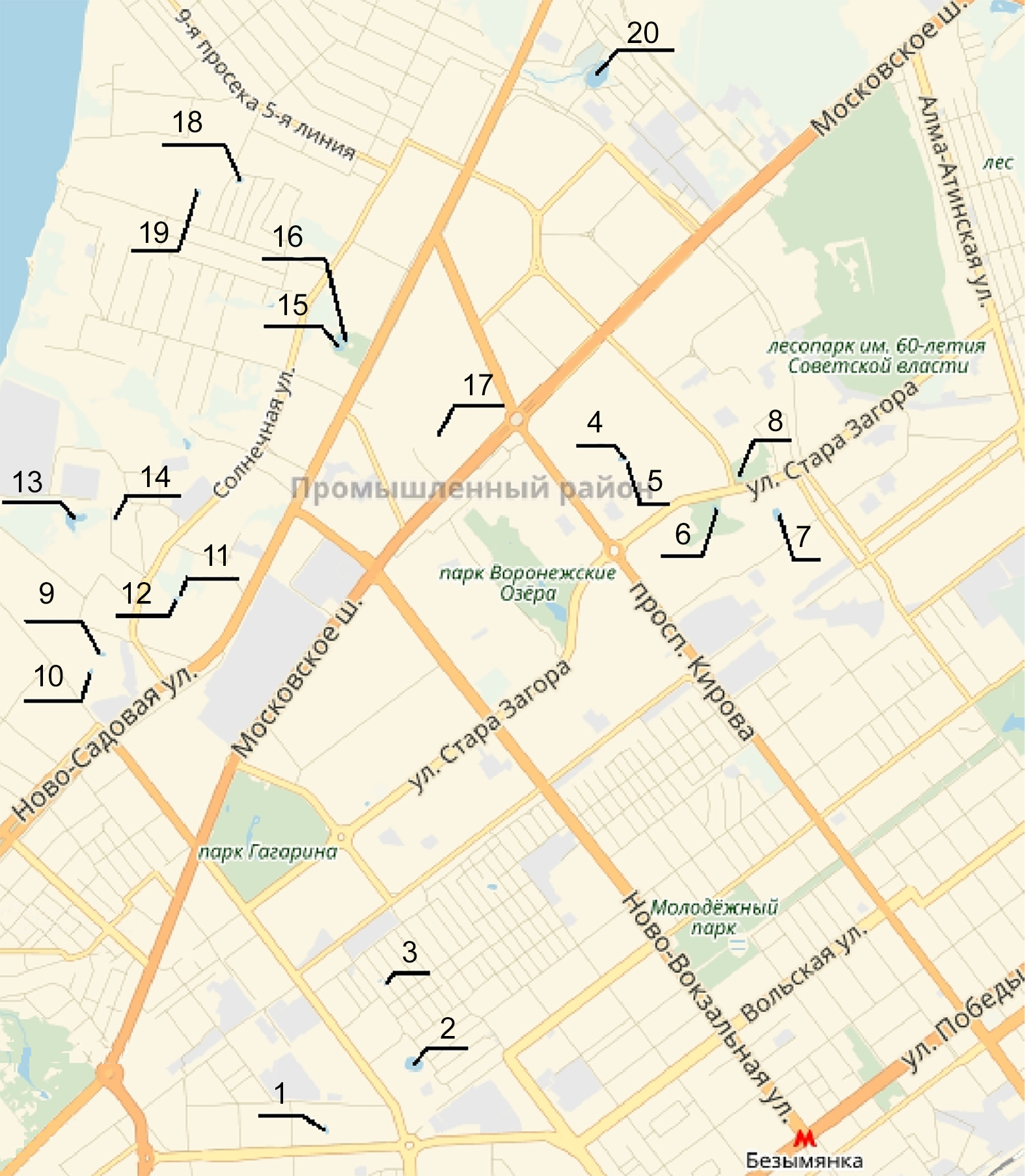 Рисунок 1 – Карта-схема расположения изучаемых прудов на территории г. Самары