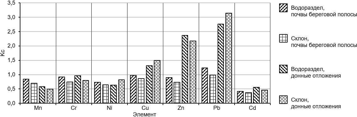 Основными элементами, в значительной степени влияющими на состояние почв береговой полосы и донных отложений изучаемых водных объектов, являются: Cu (КС от 0,3 до 20,3), Zn (КС от 0,2 до 14,9) и Pb (КС от 0,2 до 25,2). Меньший вклад в суммарное загрязнение вносят Cd (КС от 0,2 до 1,6), Ni (КС от 0,3 до 1,8), Mn (КС от 0,2 до 1,4) и Cr (КС от 0,3 до 1,4). Эти результаты сходны с результатами исследования озёр в верхнем течении реки Янцзы, окруженных урболандшафтами, поскольку также обнаруживают сильное загрязнение донных отложений свинцом, цинком и медью [16, p. 804–805].
