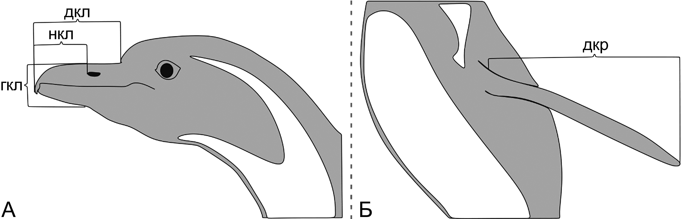 Рисунок 1 – Морфометрические параметры для гендерной идентификации пингвинов Гумбольдта. А – промеры клюва, Б – промер крыла
