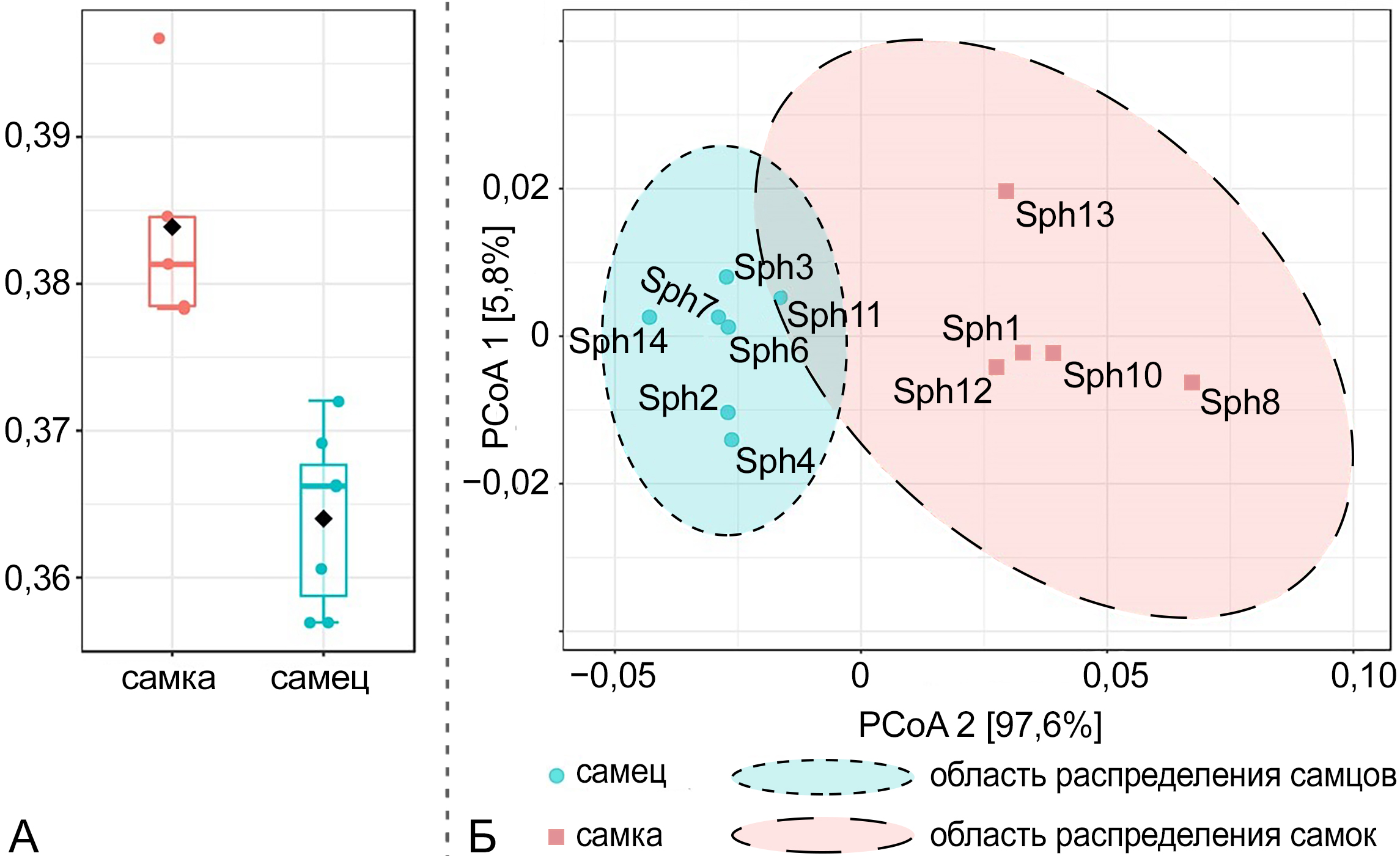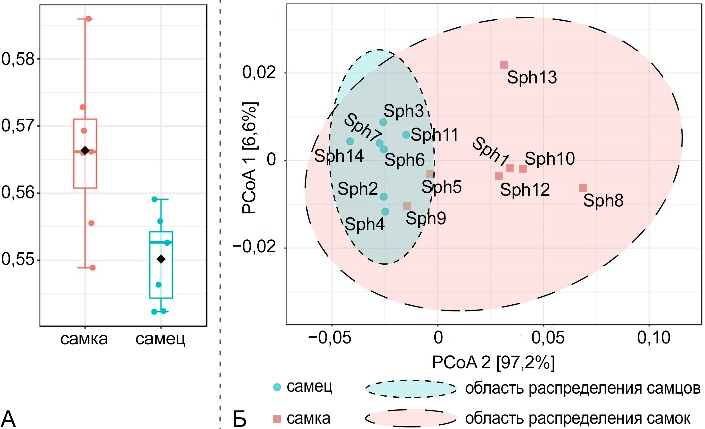 Анализ по β-разнообразию показал, что самки и самцы по длине клюва и крыла формируют статистически различимые группы. Так, p-критерий составил 0,009, а R² – 0,45691 (рис. 2: Б). Самцы более плотно располагаются в своей группе, что говорит о том, что вариабельность по описанным признакам у самцов ниже. Самки находятся в более разрозненной группе, что связано с большей вариабельностью по длине крыла и длине клюва. Так, среднее значение длины клюва у самок 58,55 ± 1,49 мм, у самцов 65,33 ± 0,51 мм; длины крыла у самок 20,19 ± 0,31 мм, у самцов 21,10 ± 0,16 мм.