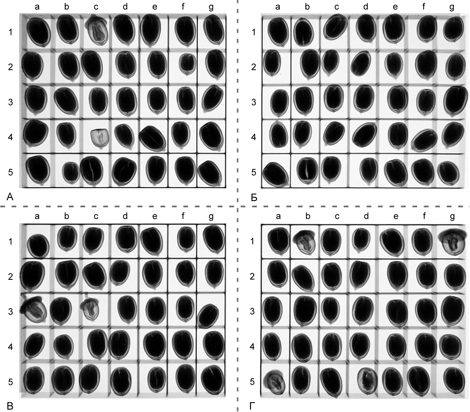 Рентгеноскопический скрининг семян дуба красного позволил нам визуально классифицировать их по определенным критериям, что продемонстрировано на рисунке 2 (эталонный планшет, специально сформированный по итогам рентгеноскопирования желудей). Так, первая категория качества – это семена, полностью сформированные, выполненные и не поврежденные насекомыми (столбцы 4, 5, строки a–e); вторая категория – семена, которые при опадении с дерева сохраняют плюску и, как оказалось, заведомо являются невыполненными (столбец 1, 2, строки a–b, d, столбец 2, строки a–e); третья категория – семена, поврежденные насекомыми в процессе формирования семядолей (столбец 3, строка 3 a–е). Для семян третьей категории характерны опадение плюски, как у качественных семян, и в разной мере выраженная деградация семядолей. Незначительное количество семян имело частичную невыполненность, при которой семядоли не заполняли объем семенных покровов (столбец 1, строка e).
