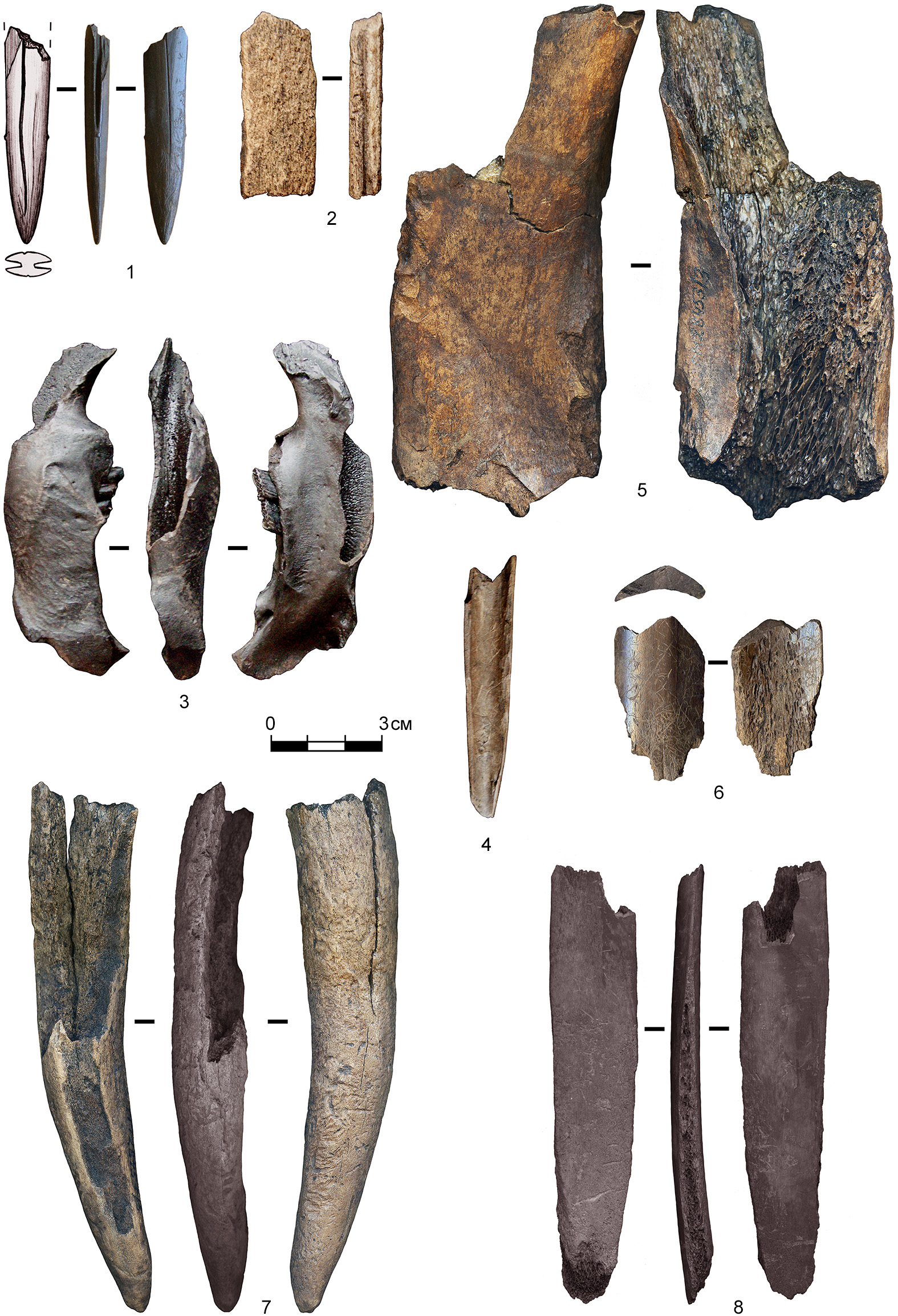 Имеется серия бытовых орудий и инструментов, существовавших на протяжении мезолита – раннего неолита. Они обнаружены во всех мезолитических и ранненеолитических слоях рассматриваемых памятников [9, с. 201; 10, с. 206; 11, с. 221]. В их число входят орудия из нижних челюстей бобра, служившие резцами, строгальными ножами и скобелями (рис. 1: 9; рис. 2: 3); широкие ножи из лопаток [10, с. 206], которые использовались как струги для снятия коры или применялись для обработки шкур (рис. 1: 8; рис. 2: 5). В ранне- и среднемезолитических слоях (рис. 1: 3, 6) и в слое раннего неолита (рис. 2: 6) Береговой II найдены обломки плоских или уплощенных прямых ножей с тупыми краями для обработки растительных волокон [3, с. 34, 35, 64, 73]. Орудия сделаны из пластин-заготовок, вырезанных из диафизов крупных трубчатых костей. Ретушёры-отжимники из отростков рога (рис. 1: 7; рис. 2: 7) и костяные шилья (рис. 2: 4) также бытуют в Зауралье с раннего мезолита до раннего неолита [9, с. 201]. В ранненеолитическом слое Береговой II найден обломок струга из ребра (рис. 2: 8). В каменном веке Урала пока одно такое орудие, остальные струги сделаны из трубчатых костей или верхних резцов бобра [3, с. 45, 67], но в Восточной Европе они широко распространены на памятниках среднего и позднего мезолита [12, с. 244, 245].