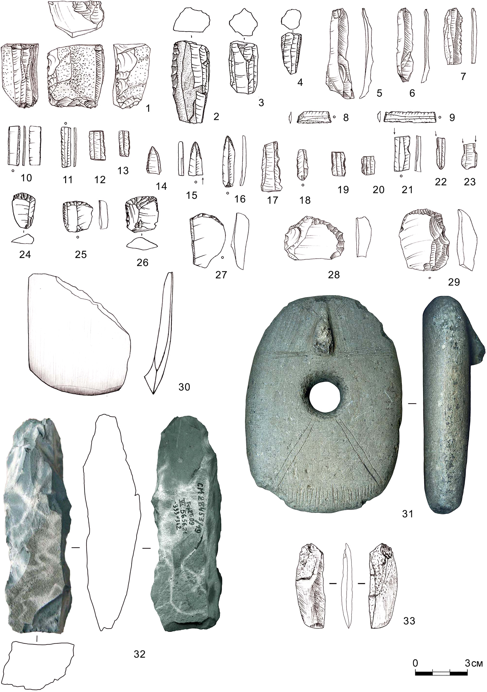 Рисунок 4 – Каменный инвентарь позднего мезолита. Стоянка Береговая II. 1–4 – нуклеусы; 5–7 – пластинки; 8, 9 – трапеции; 10–13 – сечения микропластин с ретушью; 14–16 – острия; 17–20 – пластинки с выемками; 21–23 – резцы; 24–29 – скребки; 30 – лезвие топора; 31 – диск с антропоморфной личиной; 32 – заготовка рубящего орудия; 33 – стамеска на обломке шлифованного орудия