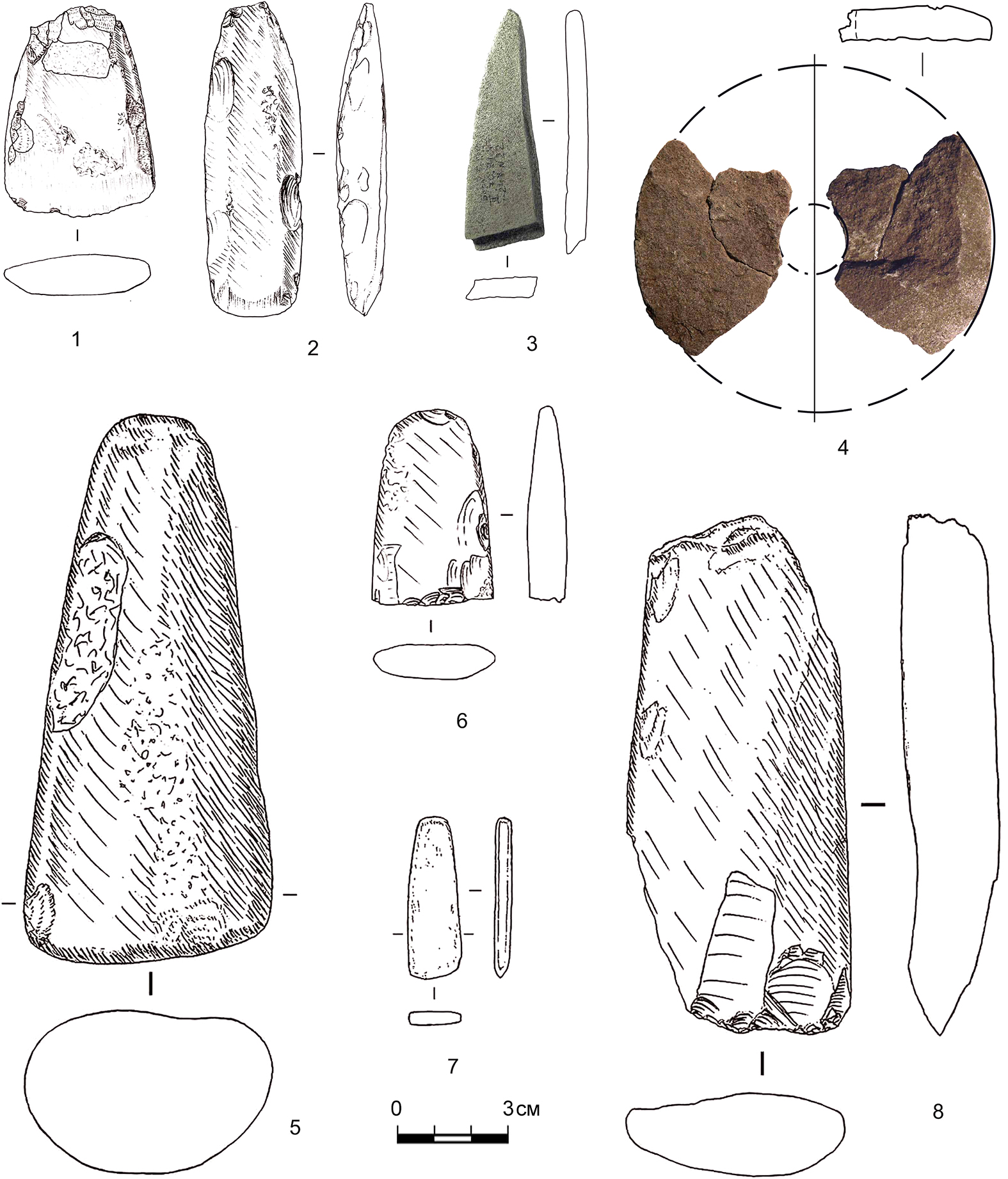 Типы шлифованных рубящих орудий близки мезолитическим, как и раньше их характерной чертой является близкое линзовидному поперечное сечение и слабо выраженные, скруглённые продольные рёбра (рис. 6: 1, 2, 6–8). На Береговой II найден плоский стержень неустановленного назначения с пришлифованным концом (рис. 6: 3).