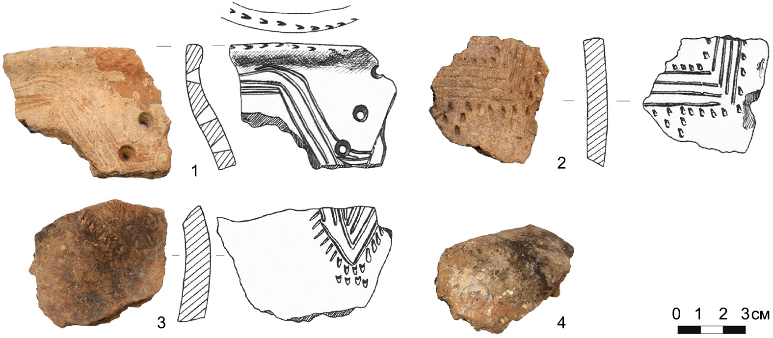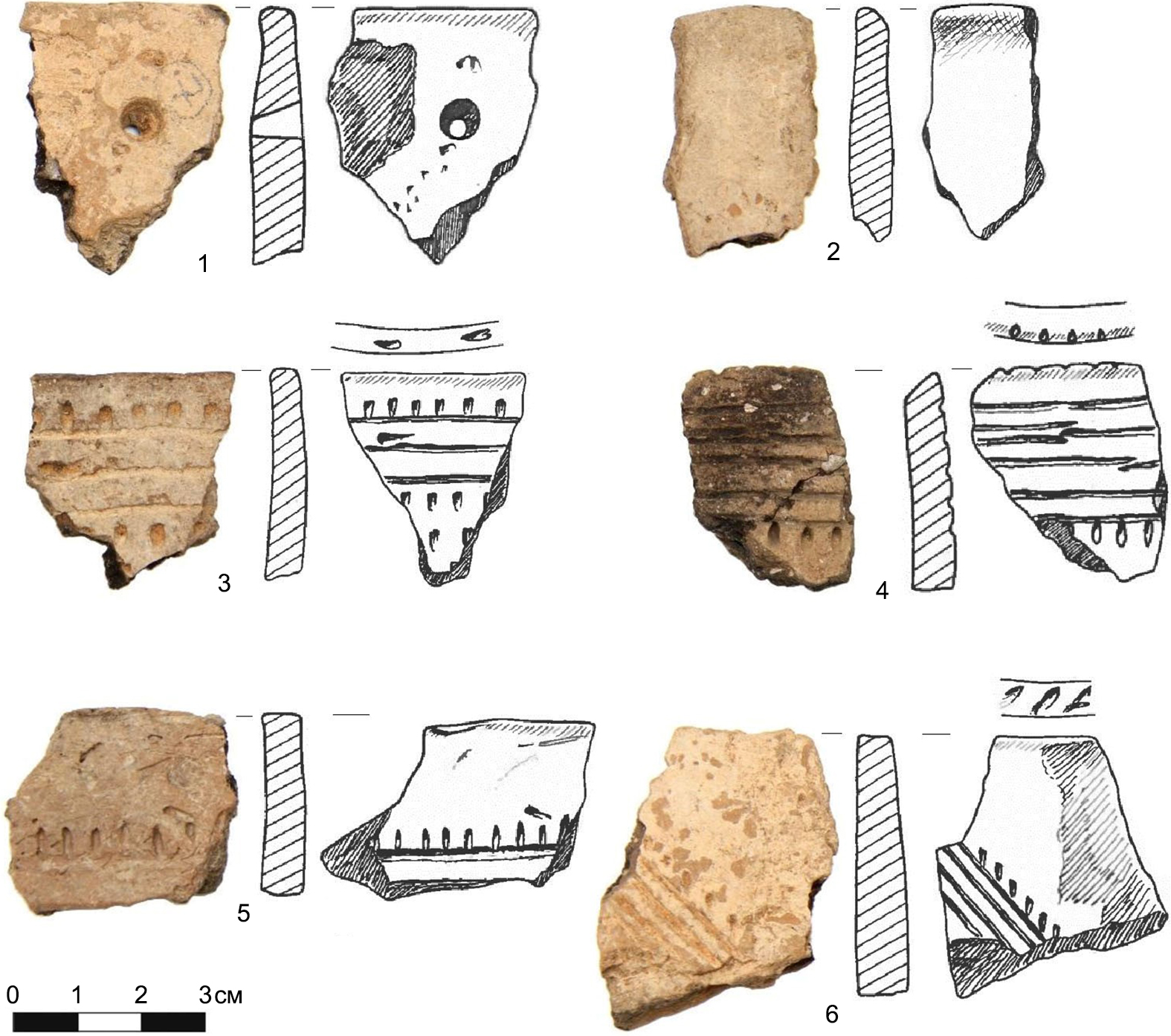 Коллекция содержит 40 фрагментов керамики: 25 орнаментированных венчиков и стенок, 14 венчиков, стенок и придонных частей без орнамента и 1 плоское днище. Для ее анализа применялся типологический и статистический методы. Толщина стенок и венчиков варьируется от 0,6 до 1,7 см. Внешняя и внутренняя поверхности черепков заглажены. На тулове встречаются конические сверлины (рис. 1: 1), порой двойные (рис. 2: 1). По венчикам и орнаментированным стенкам выделено около 15 сосудов. Их верхние части прямые (рис. 1: 1–6), а единичные отогнуты наружу (рис. 2: 2). Срезы венчиков округлые (рис. 1: 1, 2, 3; рис. 2: 1), плоские (рис. 1: 5, 6) и плоскоскошенные (рис. 1: 4). По срезу на ряде венчиков нанесены наколы (рис. 1: 3, 4, 6; рис. 2: 1). Днища плоские (рис. 2: 4). Три черепка от сосуда с ребром. На некоторых фрагментах присутствует нагар. Есть сосуды без орнамента (рис. 1: 1, 2). Узоры расположены только на верхней части горшков. Они нанесены прямыми прочерками и разреженными наколами подовальной формы. Орнаментальные композиции представлены сочетанием горизонтальных рядов прочерков с разреженными наколами (рис. 1: 3–5), наклонными рядами прочерков с наколами (рис. 1: 6), висячими треугольниками из прочерков, обрамленными наколами (рис. 2: 3), прямоугольниками из прочерков с наколами по периметру (рис. 2: 2), зигзагом из прочерков (рис. 2: 1).