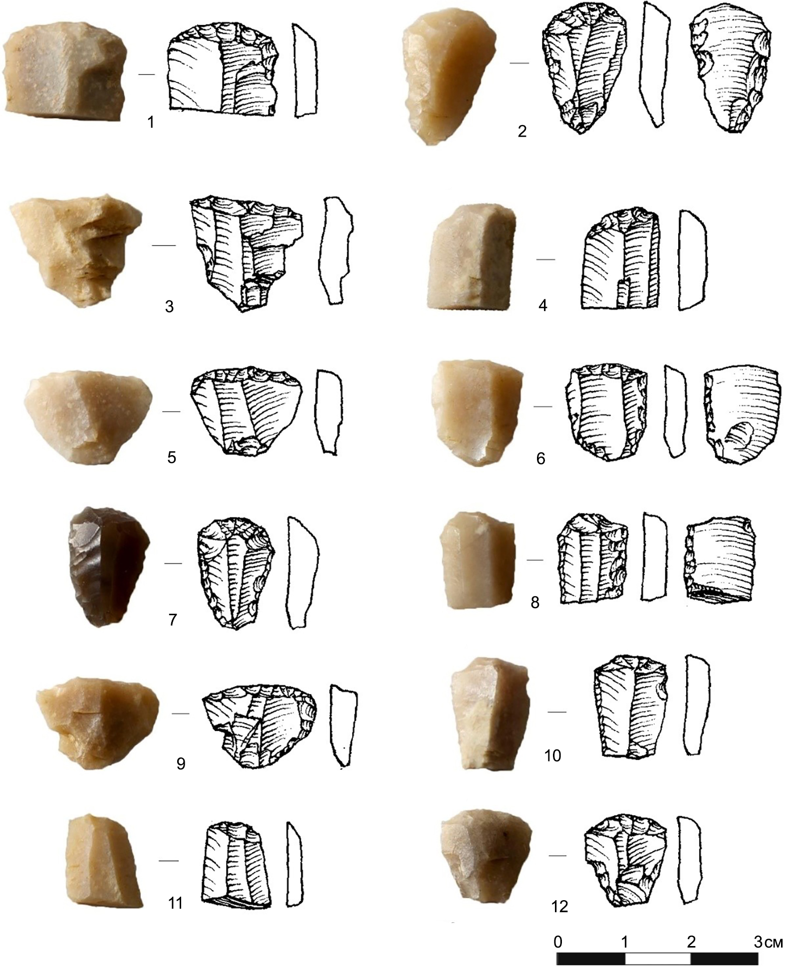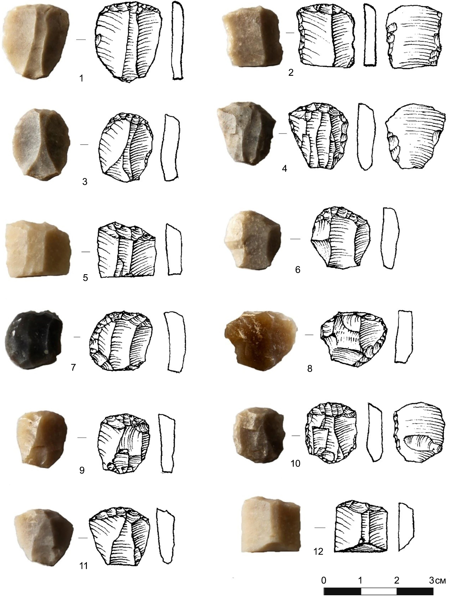 Из них 37 концевого типа на отщепах (рис. 3: 3, 4, 6, 7, 9, 11; рис. 4: 3, 7), пластинах (рис. 3: 2, 5, 12; рис. 4: 1, 4, 8, 12; рис. 5: 2, 3) и пластинчатых отщепах (рис. 3: 1; рис. 4: 2, 7; рис. 5: 1). Доминирует округлый рабочий край (рис. 3: 3, 6, 7, 11; рис. 4: 1, 2, 7, 12). Реже встречается скошенный (рис. 3: 5, 12; рис. 4: 3, 4, 11; рис. 5: 1, 6) или прямой (рис. 4: 1, 5, 6, 10; рис. 5: 2, 7). Единичны стрельчатые (рис. 5: 4), с «мордочкой» (рис. 5: 10), «со шпорой» (рис. 3: 2, 4).