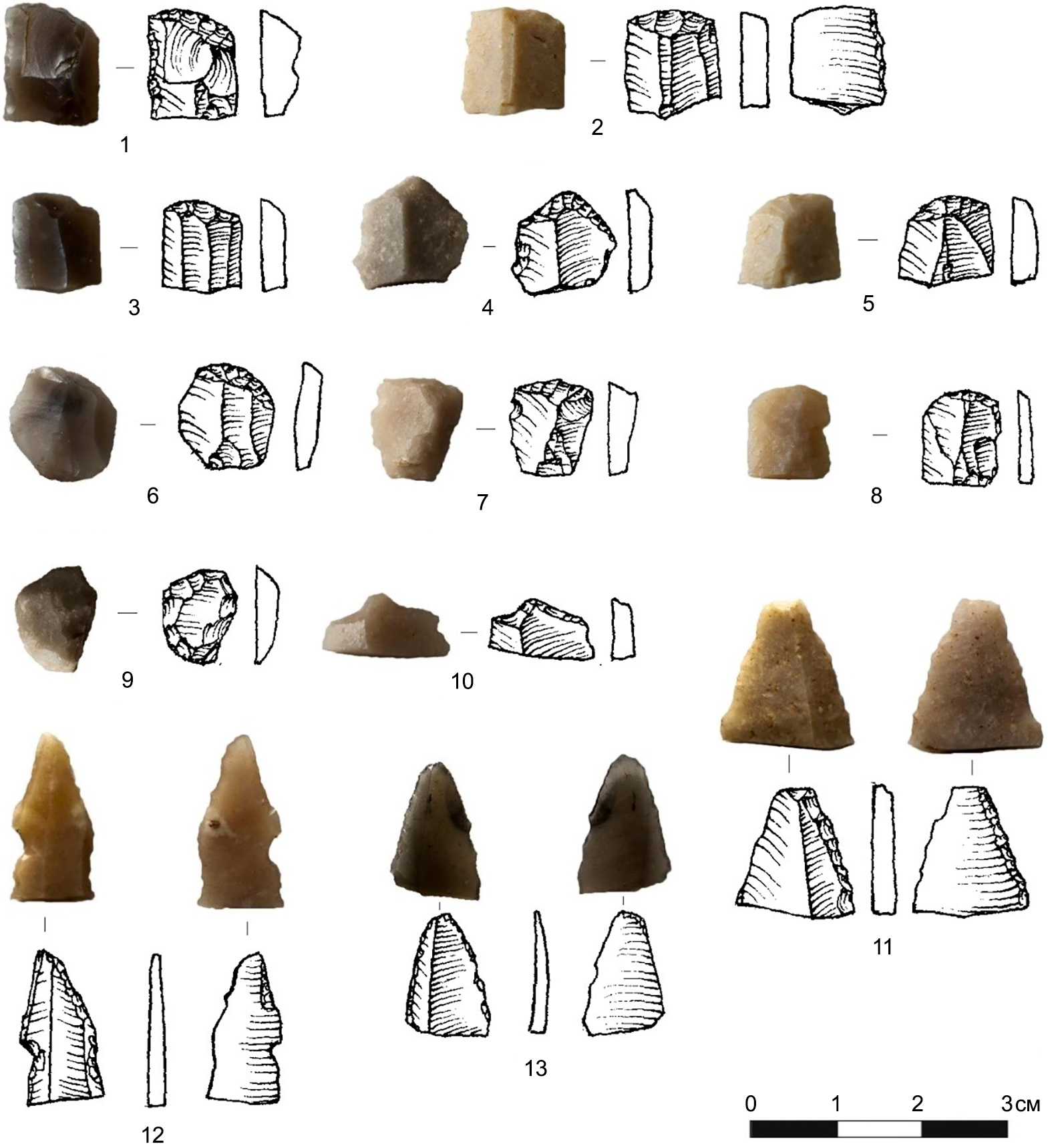 В коллекции имеется 3 симметричных острия на пластинах (рис. 5: 11–13). Рабочая часть оформлена мелкой краевой ретушью, нанесенной как по спинке, так и на брюшке.