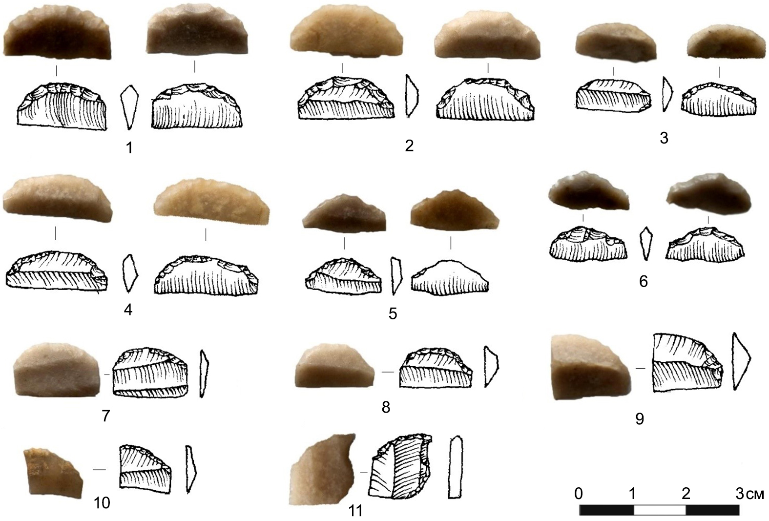 К сегментам относится 10 изделий (рис. 6: 1–10). Среди них 8 целых и 2 обломка. 6 предметов с двухсторонней обработкой дуги ретушью (рис. 6: 1–6), а 4 имеют ретушь с одной стороны (рис. 6: 7–10). С пологой ретушью со спинки – 3 экз. (рис. 6: 7, 8, 10, 11).