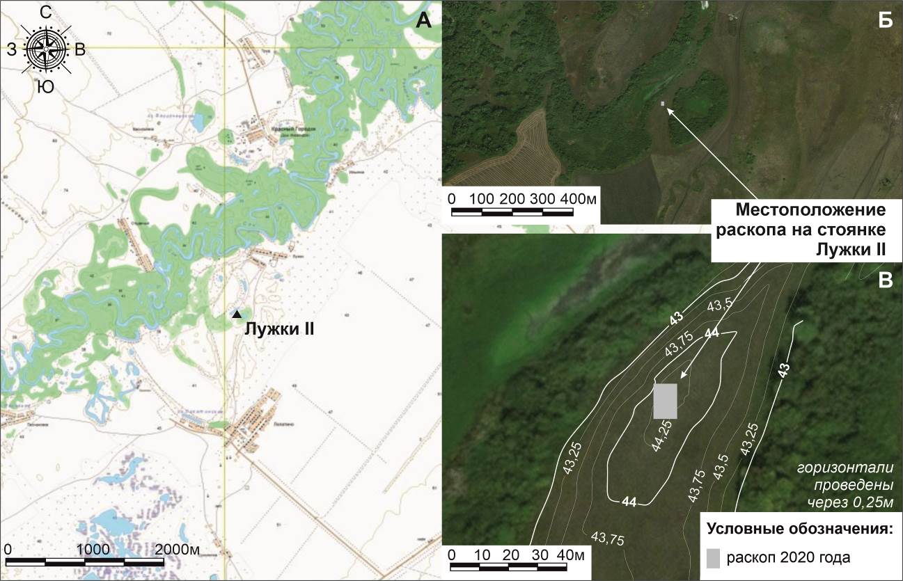 Рисунок 1 – Стоянка Лужки II. Расположение памятника. А – ситуационный план; Б – космоснимок; В – космоснимок с сечением горизонталей