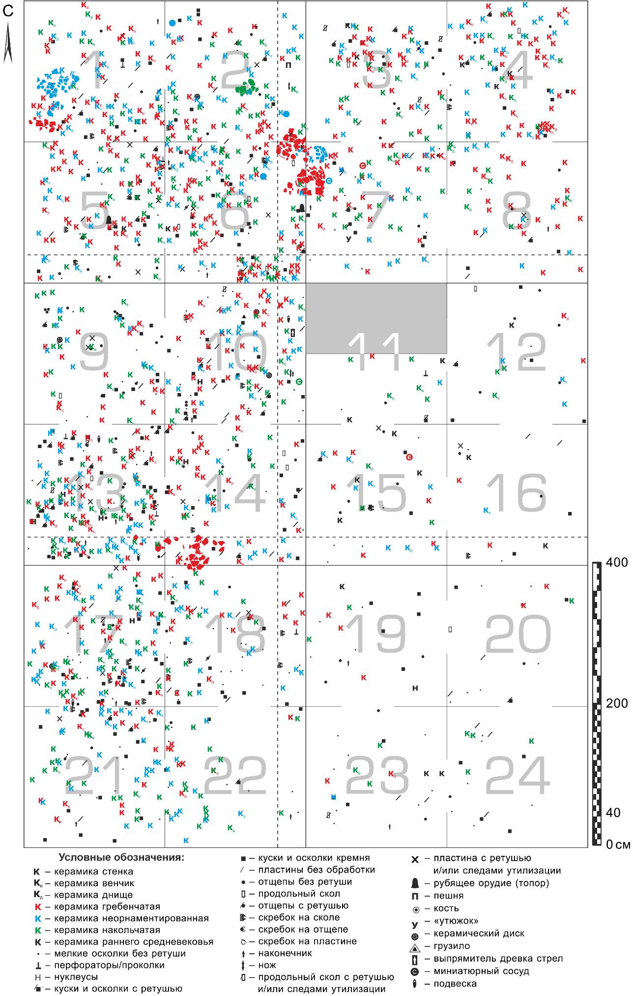 Основная концентрация находок связана с западной частью раскопа (рис. 3). При исследовании культурного слоя были обнаружены четыре скопления керамики, содержащие в совокупности 7 развалов сосудов. В стратиграфическом плане они тяготеют к основанию слоя светло-серой супеси. Первое скопление располагается в северо-западной части раскопа в 7 и 8 горизонтах, содержит два развала неолитических сосудов (Развалы №№ 1–2). Второе скопление представлено развалом одного сосуда (Развал № 3) и обнаружено во 2 кв. при исследовании 10 и 11 горизонтов. При изучении 12 горизонта было выявлено 2 скопления керамики: первое располагалось преимущественно в 6–7 кв. и содержит 3 развала неолитических сосудов (Развалы №№ 4–6); второе находилось в юго-западной части изученной площади (14 и 18 кв.кв.) и представляло собой развал одного сосуда (Развал № 7). Жилищных конструкций и очагов при исследовании культурного слоя зафиксировано не было.