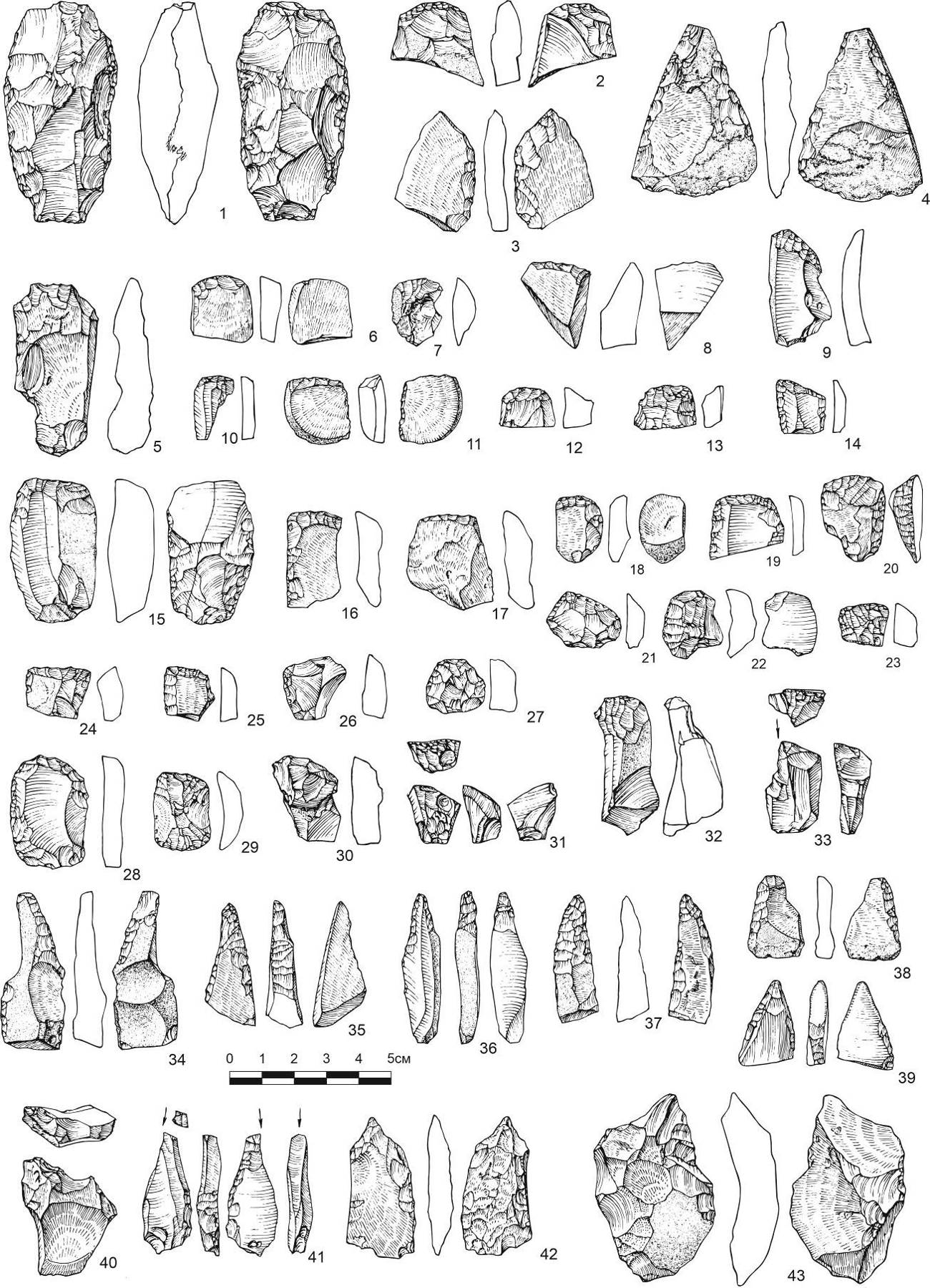 Рисунок 5 – Стоянка Лужки II. Кремневый инвентарь. 1–4 – деревообрабатывающее орудие; 5–33 – скребок; 34–43 – перфоратор