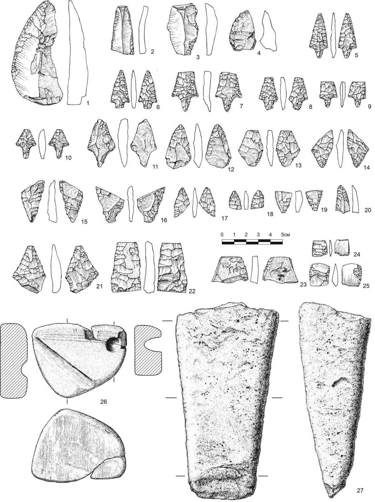 Рисунок 6 – Стоянка Лужки II. Кремневый инвентарь. 1–4 – нож; 5–22 – наконечник; 23–25 – изделие со струйчатой ретушью; 26 – «утюжок»; 27 – пешня