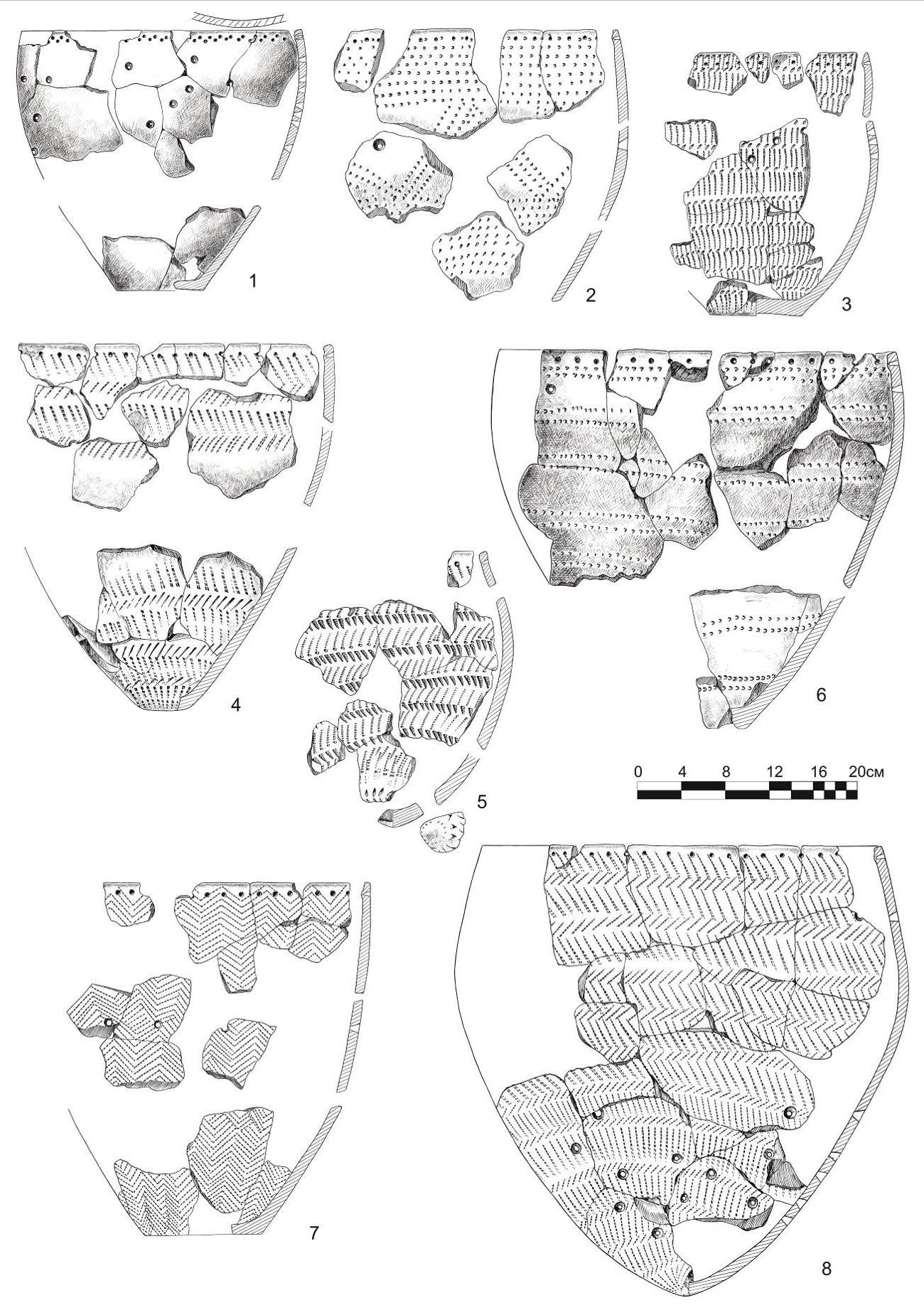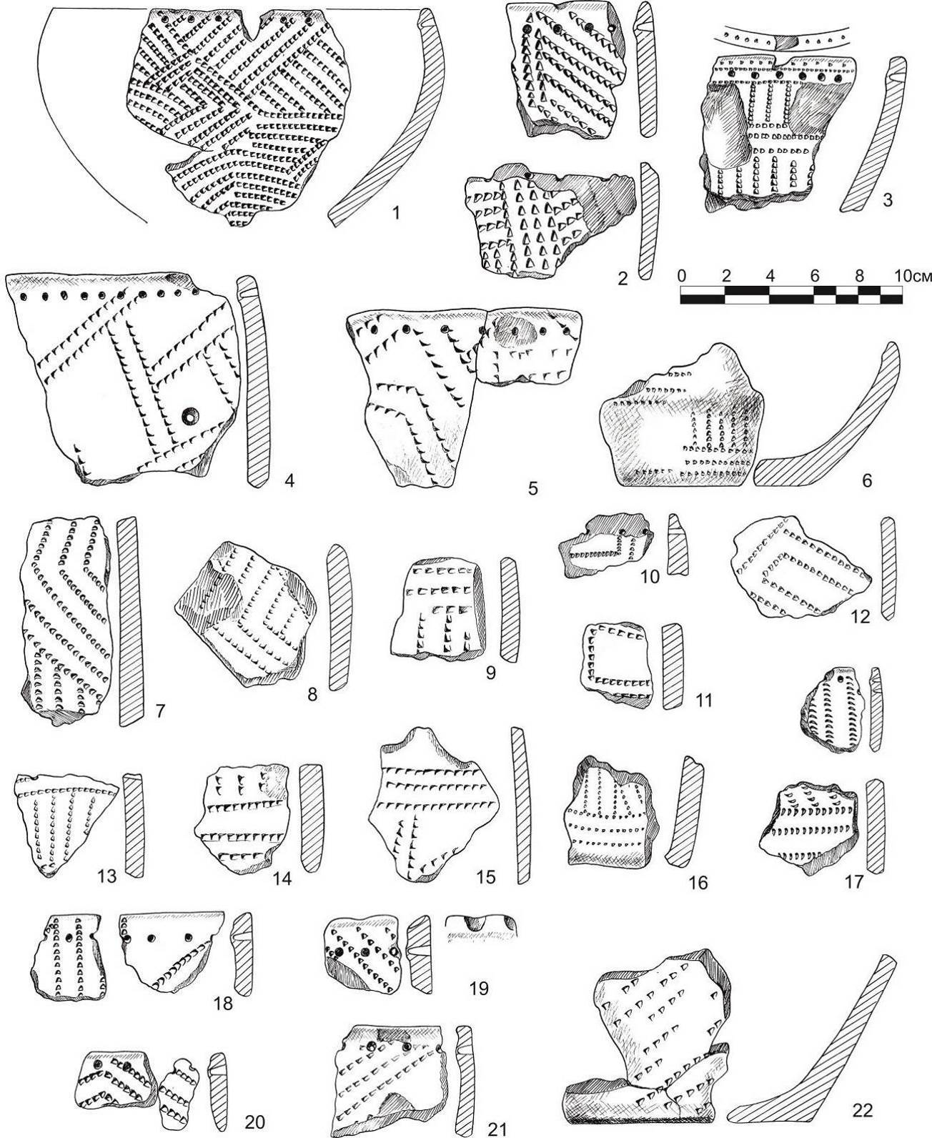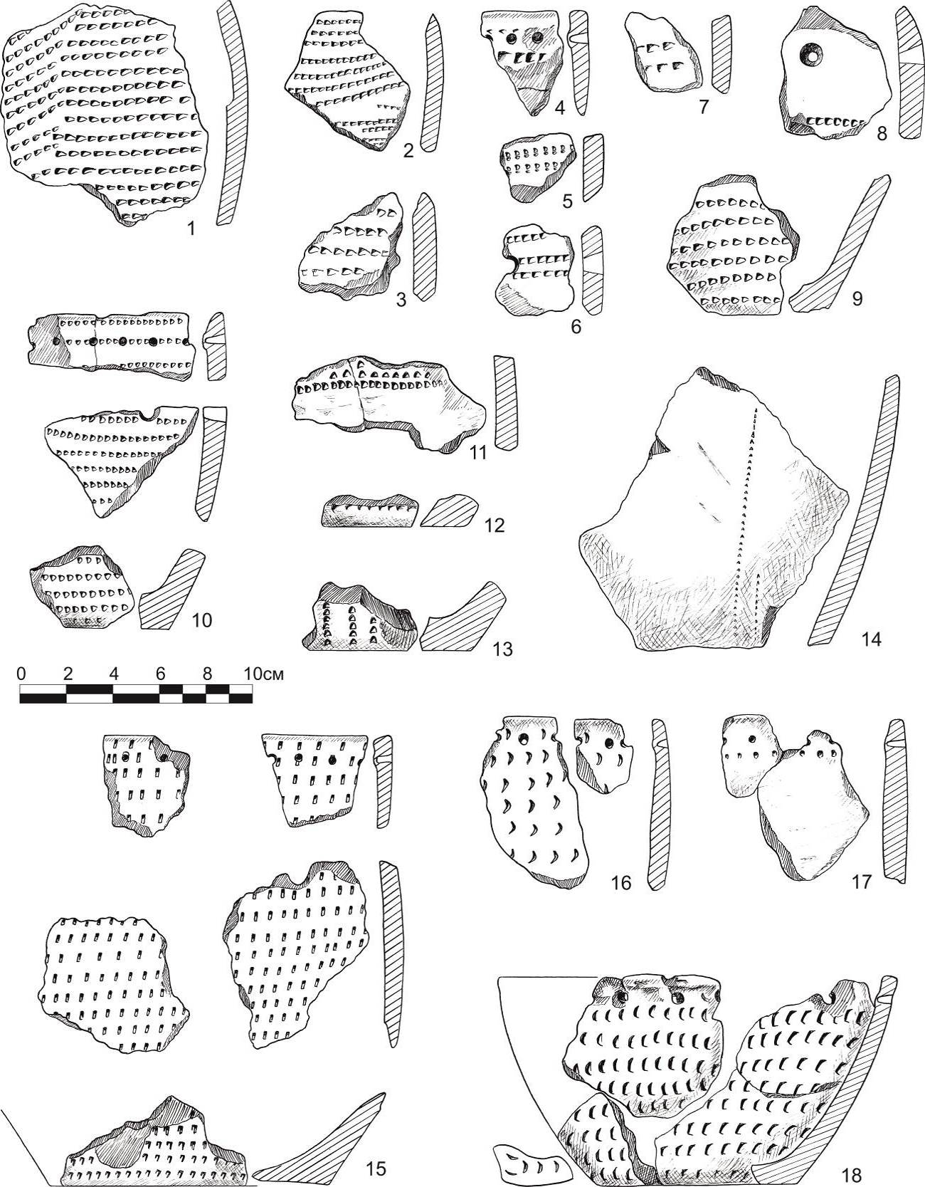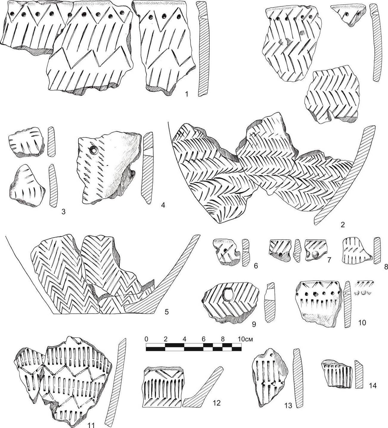 Посуда с насечками представлена 107 фрагментами керамики от 19 сосудов (рис. 8), из которых пять выделены по верхним частям. Толщина фрагментов 0,7–0,9 см. В качестве визуально определимых примесей в основном выступают шамот и песок, а также их сочетание. В единичных случаях фиксируется добавление раковины моллюсков. Поверхности черепков заглажены, лишь в двух случаях внешняя сторона подлощена. Почти все венчики прямые, по одному открытой или прикрытой формы. Срез имеет округлое или плоское оформление. В двух случаях венчик гофрирован или орнаментирован насечками. Мотивы в большинстве случаев представлены горизонтальными рядами диагонально ориентированных оттисков, реже встречены вертикальные ряды, а также их сочетание. Присутствуют более сложные композиции: вертикальная ёлочка (рис. 8: 5) и горизонтальный зигзаг (рис. 8: 1). В эту группу также были включены семь сосудов, украшенных прямым гладким штампом (рис. 8: 10–14). Среди них преобладают простые мотивы (горизонтальные ряды). В трех случаях фиксируется сочетание горизонтальных рядов с зигзагом (рис. 8: 10–12). Два сосуда помимо гладкого штампа украшены наколами (рис. 8: 13–14). Все выявленные донца (8 экз.) – плоские.