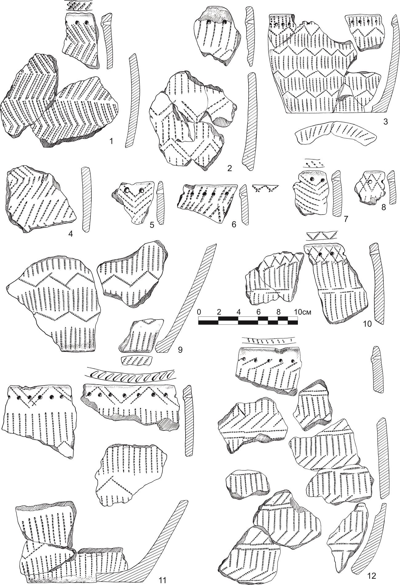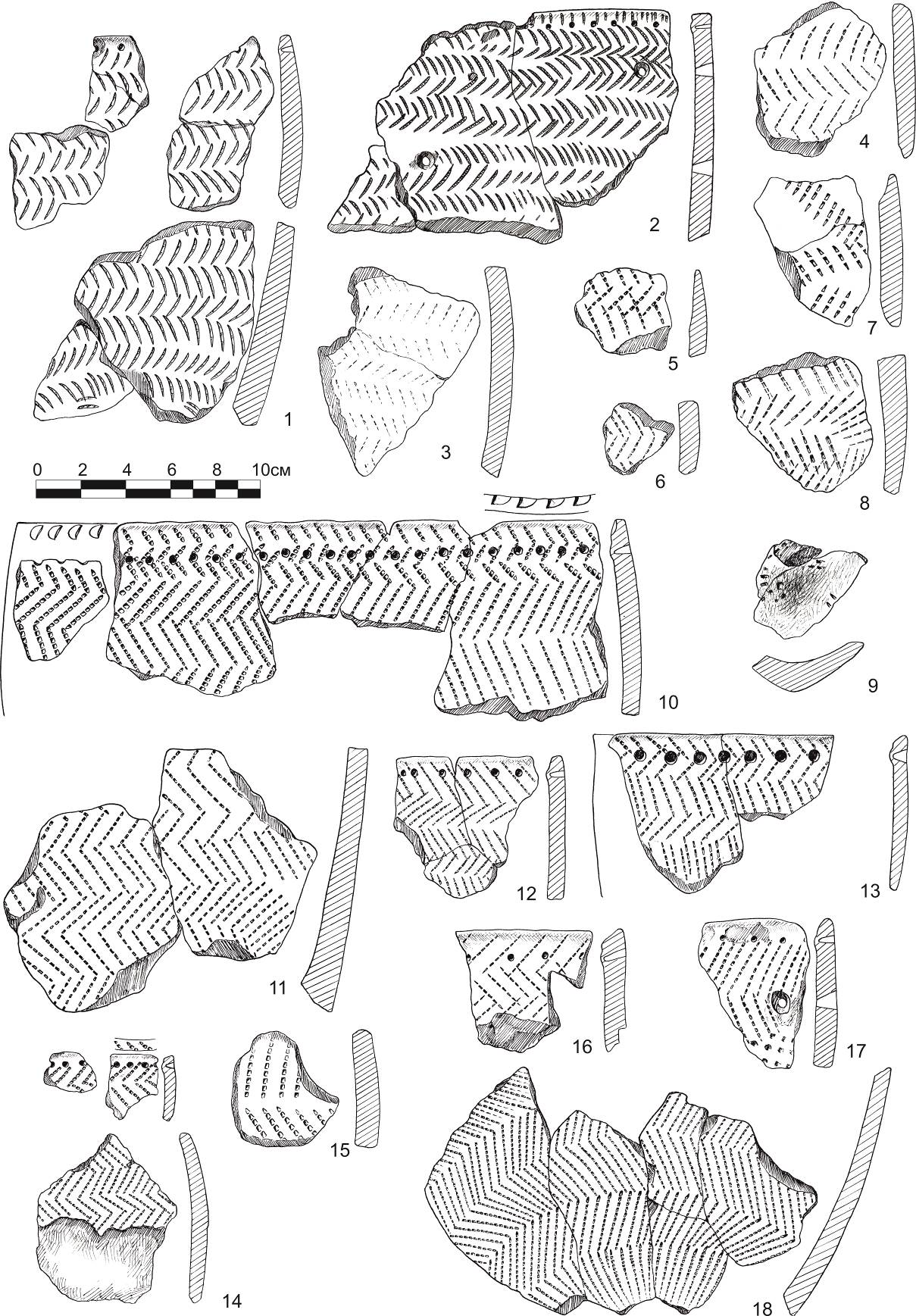 Гребенчатым штампом орнаментированы 482 фрагмента от 54 сосудов, из которых 28 выделено по верхним частям (рис. 11; рис. 12). Толщина черепков варьируется в пределах от 0,7 см до 1,4 см, в основном – 0,8–1,0 см. В качестве визуально определимых примесей выступают песок и шамот, реже раковина моллюсков. Поверхности сосудов в основном обрабатывались простым заглаживанием. В меньшей степени внешняя поверхность имеет следы лощения. На внутренней стороне иногда присутствуют горизонтальные расчесы. Венички обладают прямой (57%), открытой (25%) и закрытой (18%) формой. Доминирует округлое (17 экз.) оформление среза, значительно реже он имеет скошенную внутрь (7 экз.) или плоскую (3 экз.) форму, в одном случае приострен. Срезы зачастую орнаментированы насечками (5 экз.) или гребенчатым штампом (4 экз.). В единственном экземпляре обнаружен гофрированный венчик. Один сосуд орнаментирован гребенчатым штампом с внутренней стороны, который образует горизонтальный зигзаг. Оттиски орнаментира имеют слабоизогнутую, так называемую зубчатую (4–7 зубцов) форму (9 сосудов) (рис. 11: 1–9), выделяемую рядом исследователей в качестве особой группы, остальная посуда украшена отпечатками среднего (5–9 зубцов) и длинного (10 и более зубцов) прямого гребенчатого штампа (рис. 11: 10–18; 12). Наибольшее распространение получили простые мотивы: горизонтальные ряды из диагонально ориентированных разнонаправленных оттисков (13 экз.); горизонтальные ряды из диагонально ориентированных оттисков (10 экз.) и горизонтальные ряды из вертикально ориентированных оттисков штампа (1 экз.). Встречаются и более сложные композиции: зигзаг, косая решетка, елочка. Один сосуд украшен горизонтальными рядами диагонально и вертикально ориентированных оттисков гребенчатого штампа, разделенных двойными горизонтальными линиями. Еще один орнаментирован горизонтальным рядом косой решетки, ниже которой располагаются двойные горизонтальные ряды вертикально ориентированных отпечатков гребенчатого штампа, разделенные двойными горизонтальными оттисками, расставленными в шахматном порядке (рис. 12). К этой группе также относятся три реконструированных сосуда из выявленных скоплений: сосуд баночной формы, орнаментированный вертикальной ёлочкой – развал № 4 (рис. 13: 7); сосуд (Развал № 5) яйцевидной формы с острым дном, орнаментированный горизонтальными рядами диагонально ориентированных спаренных оттисков гребенчатого штампа, разделенных горизонтальными рядами диагонально ориентированных противолежащих оттисков (рис. 13: 8) и открытый сосуд баночной формы с плоским дном, орнаментированный горизонтальными рядами диагонально ориентированных противолежащих оттисков гребенчатого штампа (рис. 13: 4), на тулове располагается неорнаментированная зона, ниже которой проходит та же орнаментальная композиция до дна (Развал № 7). Форма дна посуды, орнаментированной гребенчатым штампом в основном плоская (12 экз.), реже фиксируется острая (3 экз.). Также встречаются сосуды, на которых гребенчатый штамп сочетается с наколами (3 экз.) или насечками (2 экз.).