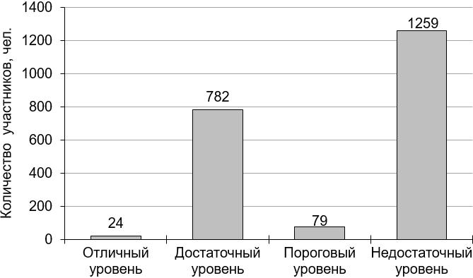 Количество участников, набравших меньше порогового значения, составило 1259 человек, что составляет 58,7% от общего количества участников. Уровень усвоения знаний этих участников классифицируется как недостаточный (рисунок 1).