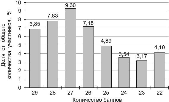 Количество участников, набравших баллы в диапазоне от 22 до 29, составило 782 человек (36,4% от общего количества участников), что позволяет говорить о достаточном уровне усвоения знаний.