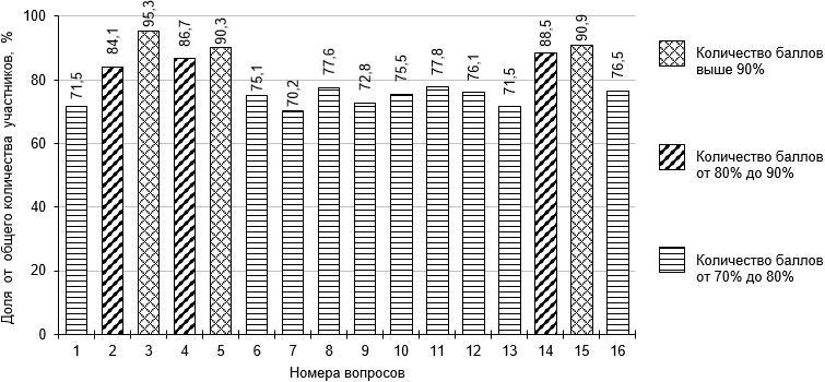 – на остальные 10 вопросов, что составляет 33,3% от общего количества вопросов, правильно ответили от 70% до 79% участников;