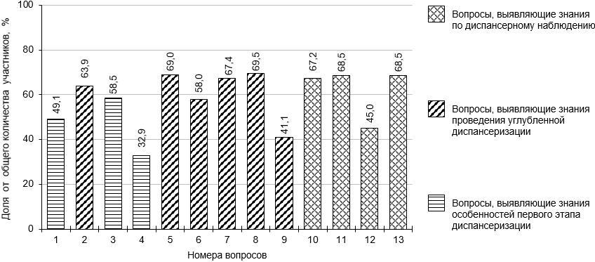 – в состав 13 вопросов входят 3 вопроса (1, 3, 4), составляющие 1,0% от общего количества вопросов, выявляющие знания тестируемых на знание организации и проведения первого этапа диспансеризации;