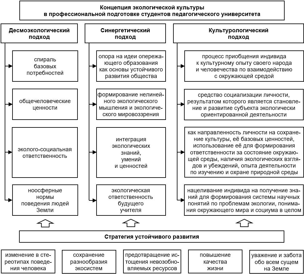 Изучая работы ученых, которые заложили основы формирования экологической культуры обучающихся (А.Н. Ильина [3], О.Е. Аляева [4], С.В. Аниськин [5], Н.Ф. Винокурова [6], В.Д. Иванов [7], В.П. Кезин [8], А.А. Лепенькина [9], Е.В. Муравьева [10] и др.), мы пришли к следующему: невзирая на то, что существует огромное количество источников по этой тематике, мы не смогли найти концепцию, решавшую данную проблему. Поэтому мы решили, что целесообразно будет разработать такую концепцию, которая бы строилась на ведущих идеях концепции устойчивого развития и трех педагогических подходах – это десмоэкологическом, синергетическом и культурологическом.