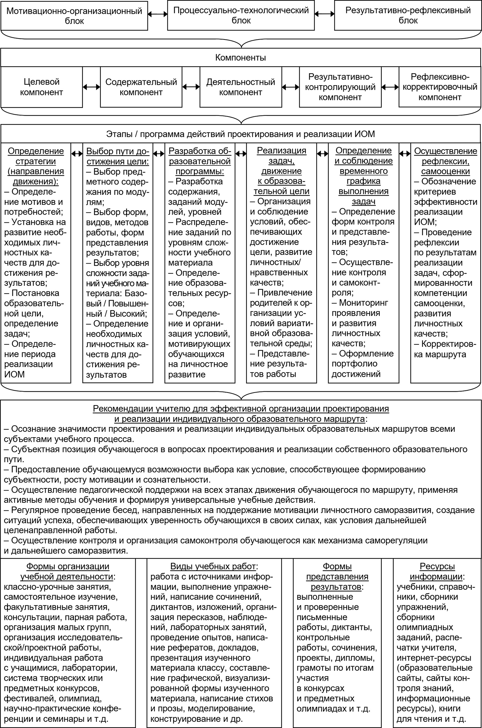 Разработанная нами модель организации ИОМ (рис. 1) характеризуется взаимосвязанностью трех блоков (мотивационно-организационный блок, процессуально-технологический блок и результативно-рефлексивный блок), включающих в себя ряд взаимосвязанных структурных компонентов и последовательные этапы работы в системе проектирования и реализации индивидуального маршрута: целевой компонент (определение стратегии – направления движения, определение мотивов и потребностей, постановка образовательной цели, определение задач, формулирование планируемых результатов и достижений, определение временного периода реализации ИОМ), содержательный и деятельностный компоненты (выбор предметного содержания, выбор форм, видов, методов работы, форм представления результатов, выбор уровня сложности заданий учебного материала, разработка образовательной программы: определение модулей предметного содержания и технологического инструментария, разработка заданий модулей, определение ресурсов информации и контрольных материалов, определение и соблюдение условий, обеспечивающих достижение цели, привлечение родителей к организации условий вариативной образовательной среды, реализация задач, представление результатов), результативно-контролирующий компонент (определение форм контроля и представления результатов, определение графика выполнения задач, осуществление контроля и самоконтроля, оформление портфолио достижений), рефлексивно-корректировочный компонент (обозначение критериев эффективности реализации ИОМ, осуществление рефлексии, самооценки, корректировка маршрута).