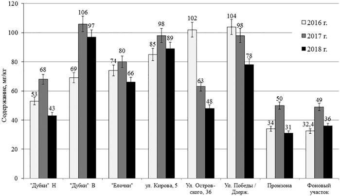 Минимальный уровень содержания меди весь период исследований был выявлен на пробных площадях в промзоне и на фоновом участке. При этом даже динамика изменения содержания меди на этих участках в период 2016–2018 гг. была очень сходной: 34,0–49,0–36,0 мг/кг – в почвах промзоны, 34,0–50,0–31,0 мг/кг – в почвах фонового участка.