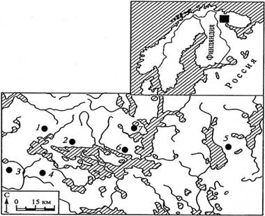 Рисунок 1 – Схема размещения постоянных пробных площадей в сосновых лесах на Кольском полуострове. Основные районы исследований: 1 – Ливский, 2 – Мавринский, 3 – Ено-Ковдорский, 4 – Уполокшский, 5 – Ловозерский, 6– Чунозерский, 7 – Мончегорский (штриховкой показаны водные поверхности)